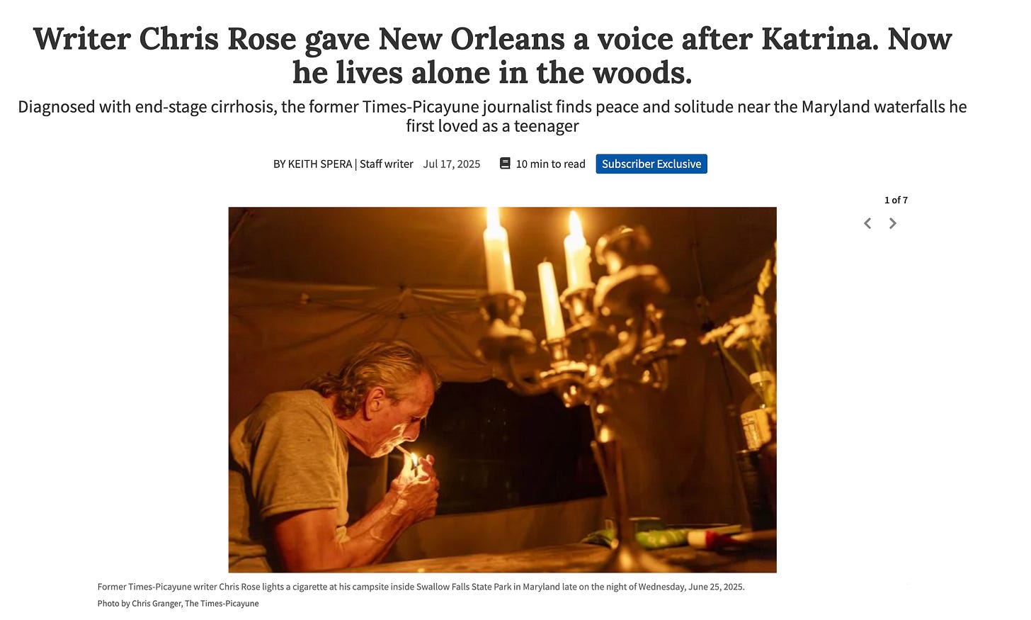 Oh man what a story, this guy was a huge deal in New Orleans after Hurricane Katrina, documenting in the local newspaper what it felt like to live there to recover there to rebuild there and I took it in from afar, but he drank too much and was depressed and the weird fame that came from it was overwhelming and then he ended up in rehab (I think?) and now lives in a tent as a park host in a Maryland state park. It’s quite a fascinating rise and fall.